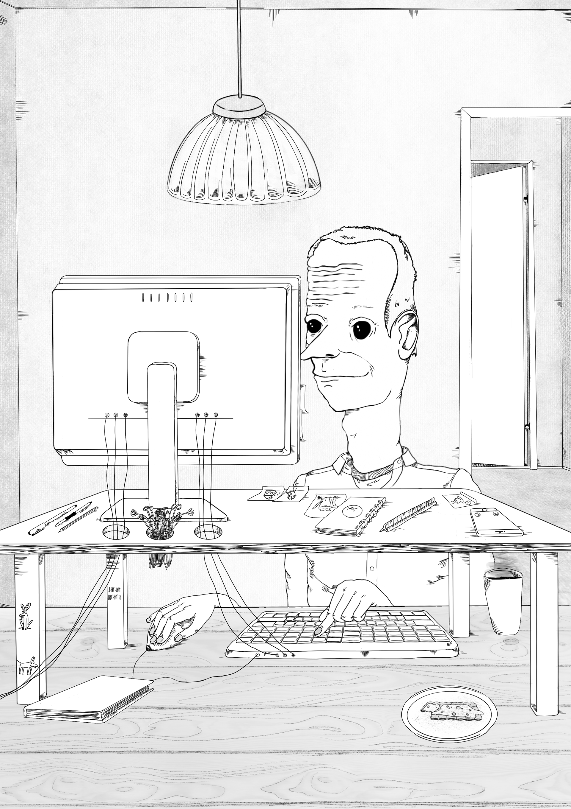 Ett av arbetsproverna till Medieinstitutet. Uppgiften var att göra ett porträtt från minne. Jag valde att illustrera min pappa vid hans hemarbetsplats som han lagt ned väldigt mycket tid och omsorg på sedan början av pandemin.